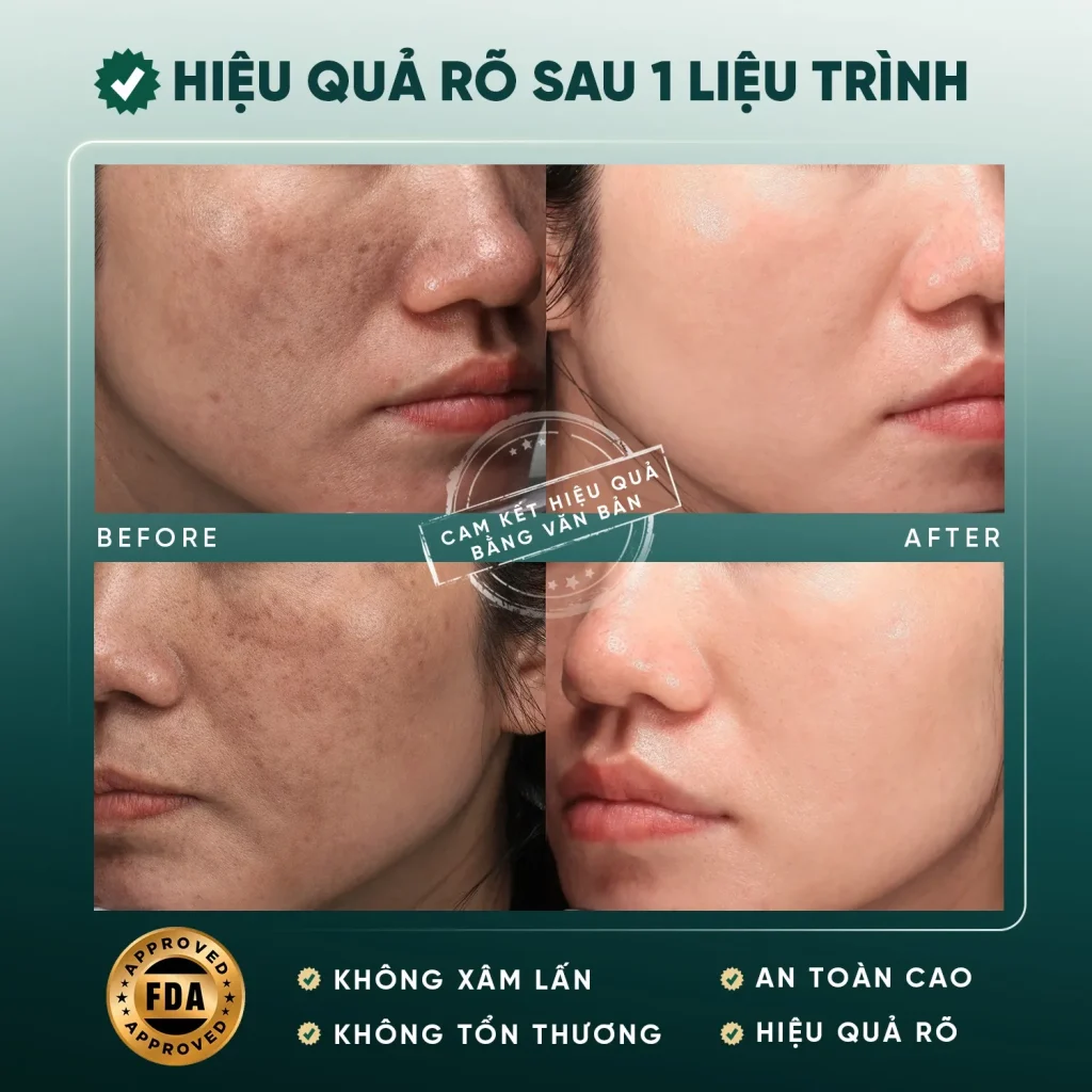 - Hiệu quả vượt trội: Xử lý triệt để nám mảng, nám sâu và tàn nhang chỉ sau liệu trình ngắn.